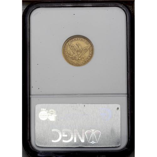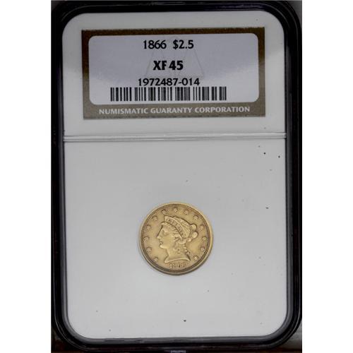 <B>1866<$2 1/2> XF45 NGC.</B></I> This extremely scarce post Civil War quarter eagle, one of just 3,080 pieces struck, is well struck save for an area of softness on the left leg of the eagle. A few small marks and scratches on each side are minimized by deep reddish-gold color overall. It is clear that the scarcity of this date exceeds what even the mintage would suggest, with less than 50 pieces currently certified by both services in all grades. Census: 9 in 45, 16 finer (3/06). <BR><BR><B>Important notice:</B> Heritage usually auctions material at the rate of 200-250 lots per hour. On some occasions eBay Live bid software or the Internet may not be able to keep up with the pace of the auction. We recommend placing a realistic absentee bid now as insurance to avoid disappointment. Occasionally the auctioneer may eliminate or reject an eBay Live bid, and the auctioneer may also reopen a lot after the close of the eBay live bidding (usually because we missed an audience bid), and may reject your bid even if it shows you as the winning bidder. By bidding via eBay Live, you agree that Heritage may award the lot to another bidder at its sole discretion under the circumstances described above or any other reasonable circumstances. Since eBay bids are not shown to us until we open the lot on the floor, we treat those bids just like floor bids. In most cases the floor responds before the eBay bid is presented to us, due to Internet lag time, so for consistency we have made it a policy that floor bids are always considered first over tie eBay live bids. Also please note that all Heritage lots purchased through eBay Live carry a 20% Buyer's Premium. Please make sure you read the Terms and Conditions before you bid. This lot is being auctioned in conjunction with a live floor auction by Heritage Galleries & Auctioneers. All final auction and invoice information will be supplied by Heritage Galleries & Auctioneers, and all other information should be considered preliminary. Lot:2413 <BR><BR><B>Winning Notification and Billing:</B> After the FINAL session in this auction is complete, Heritage will send e-mail and snail mail invoices. This process normally takes several days. All final auction and invoice information will be supplied by Heritage Galleries & Auctioneers, and all other information should be considered preliminary. <BR><BR>This auction will be conducted on a live auction floor and over the Internet through eBay Live. If you choose to place an absentee bid, please take a moment to <font color='#0000ff'><u><a href='http://pages.ebay.com/liveauctions/help/before/laabsentee.html'>learn how eBay Live absentee bidding works</a></u></font><font color='#000000'>