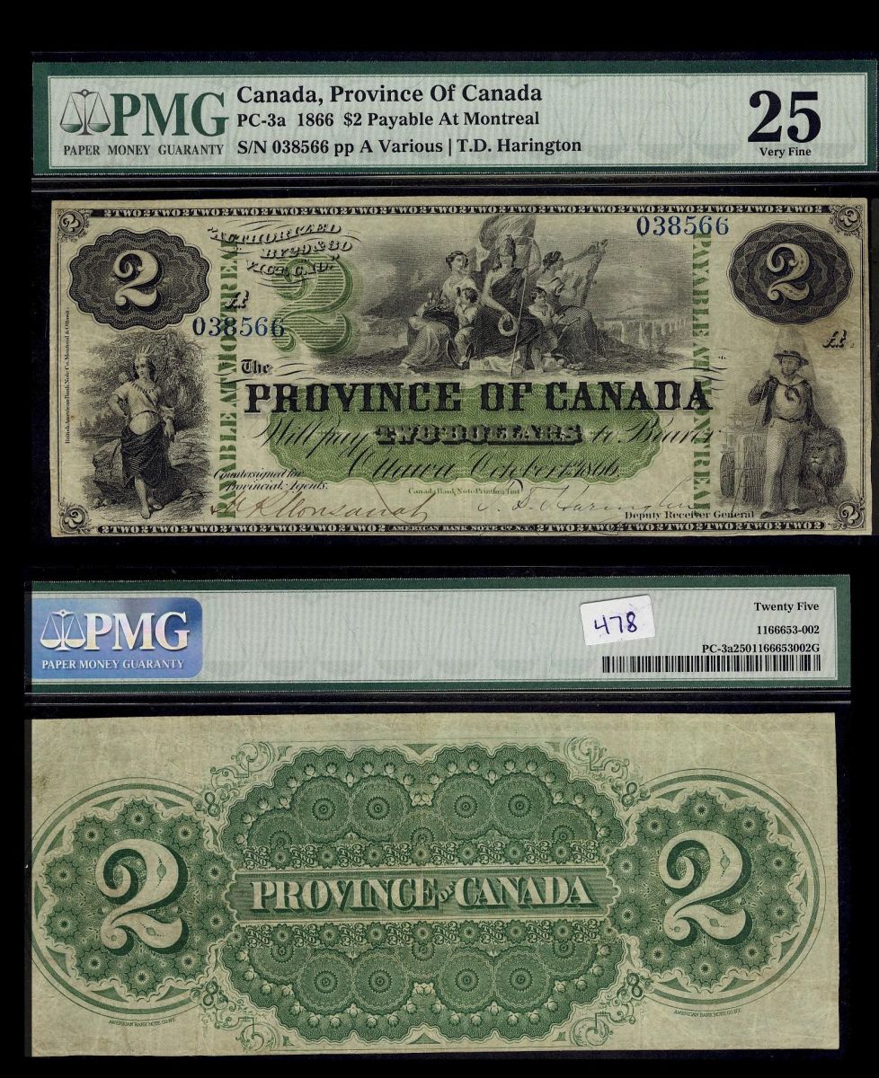 1866 $2 PC-3a #038566 PMG VF25. Unlisted above VF grade. This choice VF+ example is amazing. Will be tough to improve on this rarity. Worth a premium bid. Very rare and desirable. Despite all catalogues and expect strong bidding.