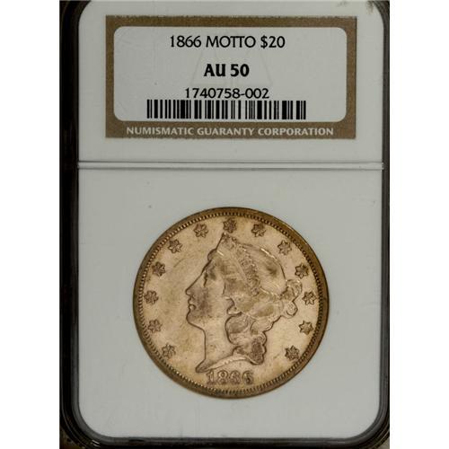 <B>1866 $20 AU50 NGC.</B></I> FS-G20-1866-801. IN GOD WE TRUST exhibits doubling, particularly on the N in IN, because two slightly different hubs were used to create the reverse die. Partly lustrous and clean for the grade aside from a solitary pinscratch near TRUST.<BR><BR><b>Shipping:</b> Coins & Currency (<a target="_blank" href="http://www.heritageauctions.com/common/shipping.php">view shipping information</a>)
