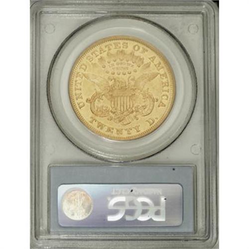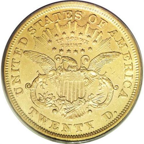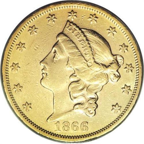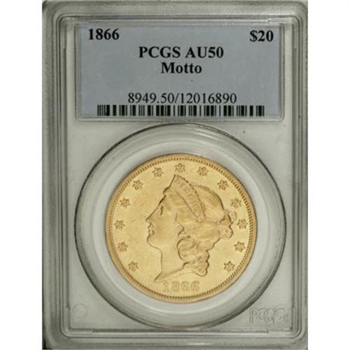 <B>1866 $20 AU50 PCGS.</B></I> First year of the Type Two double eagles with the addition of IN GOD WE TRUST on the reverse. Highly lustrous with bright yellow-gold color and excellent eye appeal. The surfaces are lightly abraded as always. This sharply struck piece will be a welcome addition to the buyer's collection. Accompanied by an NGC AU53 certification label.<BR><I>From The York/Hallenbeck #2 Current Finest PCGS Registry Set of Liberty Double Eagles.</B></I><BR><BR><B>Coin Engraver:</B> James B. Longacre<BR><BR><b>Shipping:</b> Coins & Currency (<a target="_blank" href="http://www.heritageauctions.com/common/shipping.php">view shipping information</a>)