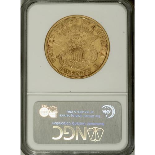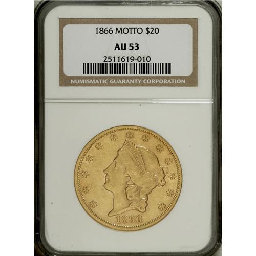 <B>1866 $20 AU53 NGC.</B></I> A briefly circulated piece that has glimpses of russet toning near the borders. Lightly hairlined, but luster individually brightens the obverse stars. This is the variety without die doubling on the motto, which may be scarcer than its doubled motto counterpart.<BR><BR><b>Shipping:</b> Coins & Currency (<a target="_blank" href="http://www.heritageauctions.com/common/shipping.php">view shipping information</a>)