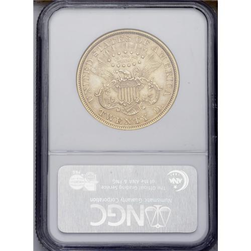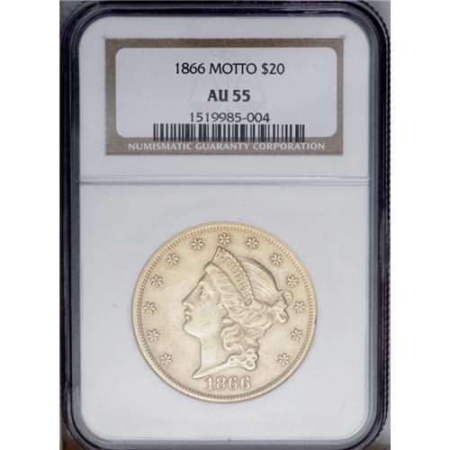 <B>1866<$20> AU55 NGC.</B></I> This bold example has no relevant marks aside from a tiny rim ding at 3 o'clock. The luster is close to full, and only traces of obverse lacquer and a slightly subdued cheek prevent a finer grade. Unlike certain 1866 double eagles, no repunching is present on the motto, new to the denomination that year.