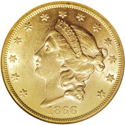 <B>1866 $20 AU58 NGC.</B></I> FS-G20-1866-801. IN GOD is die doubled, the result of a small letter hub over a large letter hub, per the <I>Cherrypicker's</B></I> reference. This radiant apricot-gold example approaches Mint State, since luster is ample and wear is barely noticeable on Liberty's shoulder curl.<BR><BR><b>Shipping:</b> Coins & Currency (<a target="_blank" href="http://www.heritageauctions.com/common/shipping.php">view shipping information</a>)