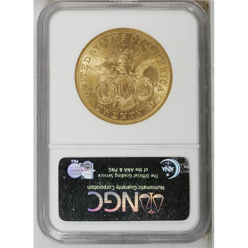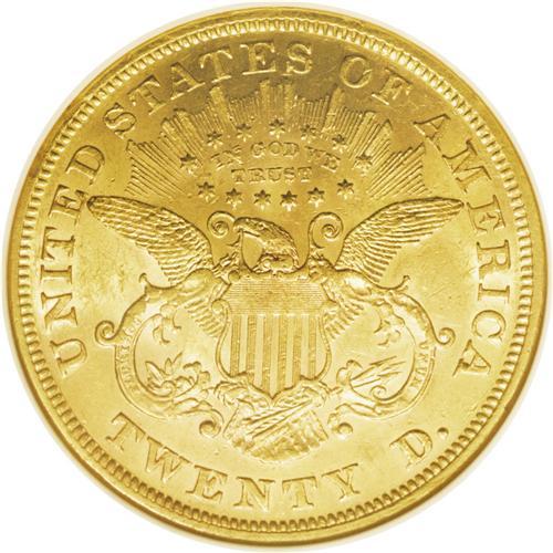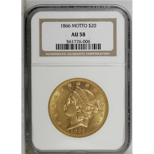 <B>1866<$20> AU58 NGC.</B></I> This interesting issue shows the motto IN GOD WE TRUST hurriedly added to the dies by hand, so that TRUST slants noticeably down to the right. There is also clear double-punching on the N in the motto, with the second punch markedly lower than the first. Considerable mint luster resides on the surfaces of this lightly circulated, appealing orange-gold piece. NGC has graded 35 coins finer (9/06).