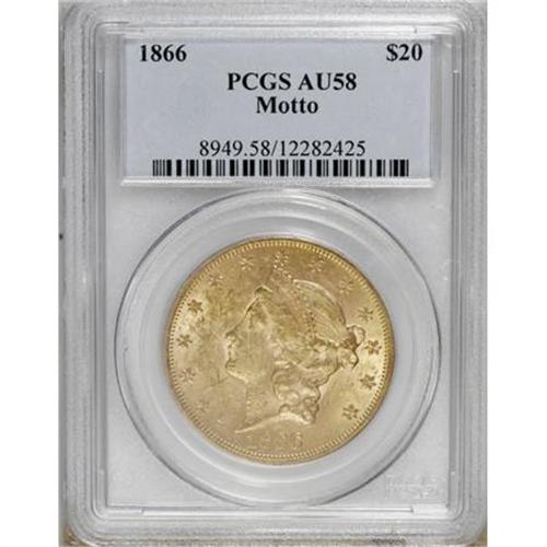 <B>1866 $20 AU58 PCGS.</B></I> With a plentiful mintage approaching 700,000 pieces, the 1866 Motto double eagle is not too difficult to locate in Very Fine or Extremely Fine condition. AU coins, however, are scarce, and Mint State example are rare. Honey-gold surfaces of this AU58 coin exhibit considerable luster, and are moderately abraded. Nicely defined throughout.<BR><BR><B>Coin Engraver:</B> James B. Longacre<BR><BR><b>Shipping:</b> Coins & Currency (<a target="_blank" href="http://www.heritageauctions.com/common/shipping.php">view shipping information</a>)