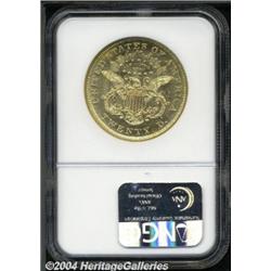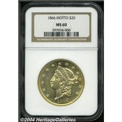 <B>1866<$20> MS60 NGC.</B></I> Like the 1865, the 1866 is more difficult to locate in Mint State than the 1872, 1874, and 1875. Most survivors of this first-year Motto issue fall into the VF-AU grade range; Mint State examples are few in number and do not grade any finer than MS62 (at NGC and PCGS, 6/04). This is not a bad looking coin for the grade. The number of abrasions is typical, the luster is bright with a frosty texture, and the color is an original, rich golden-rose shade. Boldly impressed, as well. <BR><BR><B>Important notice:</B> Heritage usually auctions material at the rate of 200-250 lots per hour. On some occasions eBay Live bid software or the Internet may not be able to keep up with the pace of the auction. We recommend placing a realistic absentee bid now as insurance to avoid disappointment. Occasionally the auctioneer may eliminate or reject an eBay Live bid, and the auctioneer may also reopen a lot after the close of the eBay live bidding (usually because we missed an audience bid), and may reject your bid even if it shows you as the winning bidder. By bidding via eBay Live, you agree that Heritage may award the lot to another bidder at its sole discretion under the circumstances described above or any other reasonable circumstances. Since eBay bids are not shown to us until we open the lot on the floor, we treat those bids just like floor bids. In most cases the floor responds before the eBay bid is presented to us, due to Internet lag time, so for consistency we have made it a policy that floor bids are always considered first over tie eBay live bids. Also please note that all Heritage lots purchased through eBay Live carry a 20% Buyer's Premium. Please make sure you read the Terms and Conditions before you bid. </span></font></tr></table></td></tr></table>
