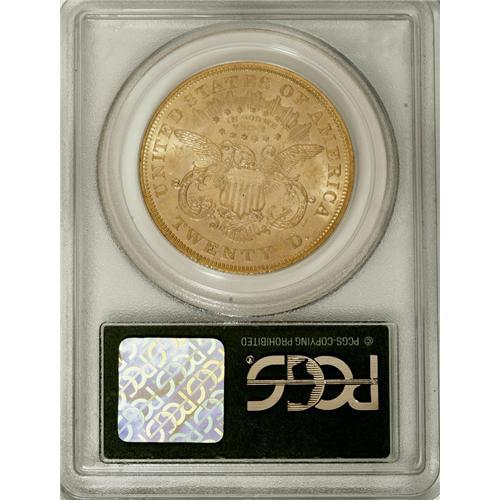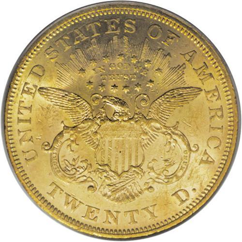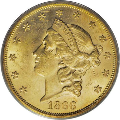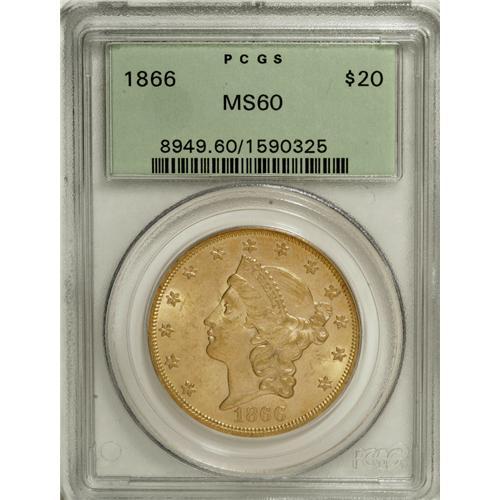 <B>1866 $20 MS60 PCGS.</B></I> The 1866 Philadelphia double eagle marks the introduction of the Type 2 design, with the motto IN GOD WE TRUST added to the reverse. With a fairly plentiful mintage (close to 700,000 pieces), it is not too difficult to locate in VF or XF. AU examples are scarce, and Mint State pieces are rare. Yellow and orange-gold surfaces of this MS60 coin display the most powerful luster in the areas around, and in the interstices of, the design elements. Sharp definition has resulted from a well executed strike. Several small marks are scattered about, but these are fewer in frequency and intensity than typically occurring on this issue. Housed in a green-label holder. Population: 9 in 60, 7 finer (3/07).<BR><BR><b>Shipping:</b> Coins & Currency (<a target="_blank" href="http://www.heritageauctions.com/common/shipping.php">view shipping information</a>)
