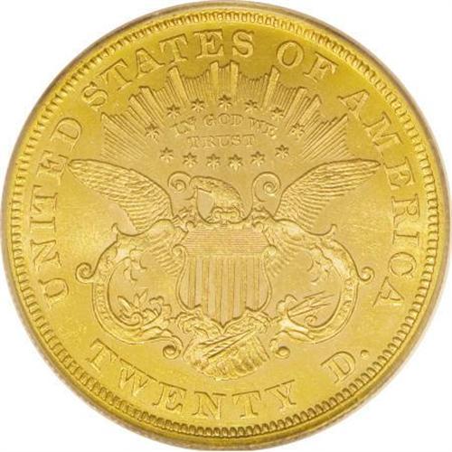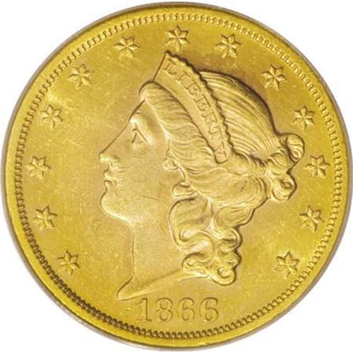<B>1866 $20 MS61 PCGS.</B></I> This is a stunning Mint State example that represents the debut of the Type Two coinage, featuring the addition of IN GOD WE TRUST inside the constellation of 13 stars on the reverse. The mintage of this issue was nearly 700,000 coins, suggesting that it should be plentiful today. While this may be true in lower circulated grades through XF, examples that qualify as AU are elusive, and any Mint State grade is a rarity. The four finer certified examples include MS62 and MS63 Prooflike pieces certified by NGC, and MS62 and MS64 pieces certified by PCGS. Both sides have deep honey-gold color and the fields are prooflike with full obverse and reverse mirrors. Excellent eye appeal is created by the addition of orange toning. Population: 6 in 61, 2 finer (6/07).<BR><BR><B>Coin Engraver:</B> James B. Longacre<BR><BR><b>Shipping:</b> Coins & Currency (<a target="_blank" href="http://www.heritageauctions.com/common/shipping.php">view shipping information</a>\)