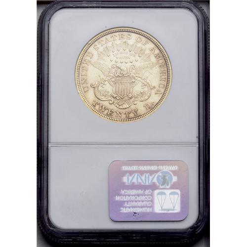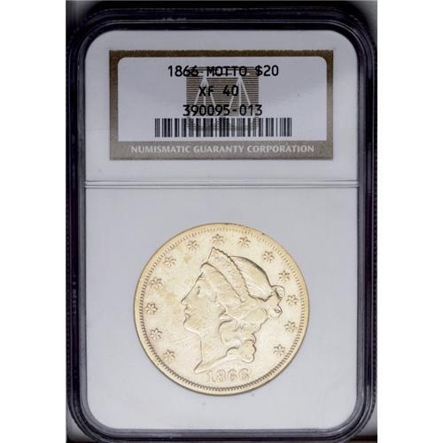 <B>1866<$20> XF40 NGC.</B></I> An appealing example of this first year, With Motto type. The surfaces are mostly pale yellow-gold with plum accents around much of the reverse design detail. Bothersome marks are also few and far between.<BR><I>From The Steve Glenn Collection.</B></I> <BR><BR><B>Important notice:</B> Heritage usually auctions material at the rate of 200-250 lots per hour. On some occasions eBay Live bid software or the Internet may not be able to keep up with the pace of the auction. We recommend placing a realistic absentee bid now as insurance to avoid disappointment. Occasionally the auctioneer may eliminate or reject an eBay Live bid, and the auctioneer may also reopen a lot after the close of the eBay live bidding (usually because we missed an audience bid), and may reject your bid even if it shows you as the winning bidder. By bidding via eBay Live, you agree that Heritage may award the lot to another bidder at its sole discretion under the circumstances described above or any other reasonable circumstances. Since eBay bids are not shown to us until we open the lot on the floor, we treat those bids just like floor bids. In most cases the floor responds before the eBay bid is presented to us, due to Internet lag time, so for consistency we have made it a policy that floor bids are always considered first over tie eBay live bids. Also please note that all Heritage lots purchased through eBay Live carry a 20% Buyer's Premium. Please make sure you read the Terms and Conditions before you bid. This lot is being auctioned in conjunction with a live floor auction by Heritage Galleries & Auctioneers. All final auction and invoice information will be supplied by Heritage Galleries & Auctioneers, and all other information should be considered preliminary. Lot:4218 <BR><BR><B>Winning Notification and Billing:</B> After the FINAL session in this auction is complete, Heritage will send e-mail and snail mail invoices. This process normally takes several days. All final auction and invoice information will be supplied by Heritage Galleries & Auctioneers, and all other information should be considered preliminary. <BR><BR>This auction will be conducted on a live auction floor and over the Internet through eBay Live. If you choose to place an absentee bid, please take a moment to <font color='#0000ff'><u><a href='http://pages.ebay.com/liveauctions/help/before/laabsentee.html'>learn how eBay Live absentee bidding works</a></u></font><font color='#000000'>