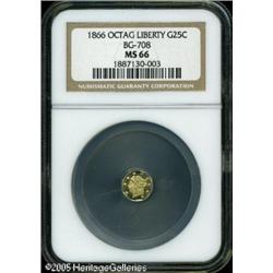 <B>1866 25C Liberty Octagonal 25 Cents, BG-708, High R.4, MS66 NGC.</B></I> A bright and semi-prooflike premium Gem, the glassy surfaces are smooth with the exception of a die crack (as struck) that traverses the left side of Liberty's face. Rather nicely struck for a fractional gold issue. Population: 1 in 66, 0 finer (1/05). Lot:9787
