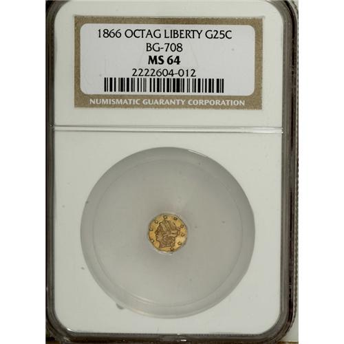 <B>1866 25C Liberty Octagonal 25 Cents, BG-708, High R.4, MS64 NGC.</B></I> NGC Census: (2/4). PCGS Population (15/11). (#10535)<BR><BR><b>Shipping:</b> Coins & Currency (<a target="_blank" href="http://www.heritageauctions.com/common/shipping.php">view shipping information</a>)