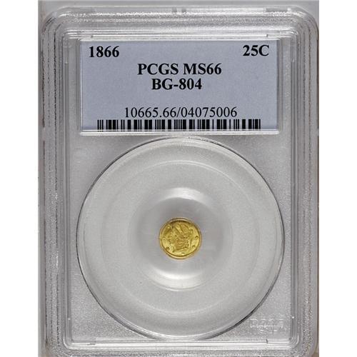 <B>1866<25C> Liberty Round 25 Cents, BG-804, R.4, MS66 PCGS.</B></I> Yellow-gold with traces of green. The surfaces are lustrous and extremely well-preserved. Population: 3 in 66, 0 finer (7/06).