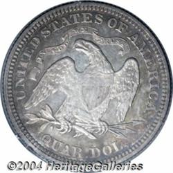 <table><tr><td><table><tr><td>1866 25C Motto MS63 PCGS. The centers are typically struck, although the borders are bold. Several vertical adjustment-like marks are noted at the center of the obverse. Moderate golden-brown toning deepens to electric-blue at the borders. Only 16,800 pieces were struck, and contemporary numismatists were satisfied with proof examples. Housed in an early PCGS holder. Population: 2 in 63, 10 finer (2/04). <BR><BR><B>Important notice:</B> Heritage usually auctions material at the rate of 200-250 lots per hour. On some occasions eBay Live bid software or the Internet may not be able to keep up with the pace of the auction. We recommend placing a realistic absentee bid now as insurance to avoid disappointment. Occasionally the auctioneer may eliminate or reject an eBay Live bid, and the auctioneer may also reopen a lot after the close of the eBay live bidding (usually because we missed an audience bid), and may reject your bid even if it shows you as the winning bidder. By bidding via eBay Live, you agree that Heritage may award the lot to another bidder at its sole discretion under the circumstances described above or any other reasonable circumstances. Since eBay bids are not shown to us until we open the lot on the floor, we treat those bids just like floor bids. In most cases the floor responds before the eBay bid is presented to us, due to Internet lag time, so for consistency we have made it a policy that floor bids are always considered first over tie eBay live bids. Also please note that all Heritage lots purchased through eBay Live carry a 20% Buyer's Premium. Please make sure you read the Terms and Conditions before you bid. <BR><BR><B>IMPORTANT ANNOUNCEMENT ABOUT RESERVES:</B> Heritage now divulges all reserves on its web site 7 days before every auction. If you want to know whether the reserve on this lot has been met, and if not, what the reserve amount is, please visit this lot page on the HeritageCoin.com web site, or email: bid@HeritageGalleries.com </span></font></td></tr></table></td></tr></table>