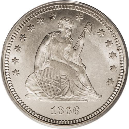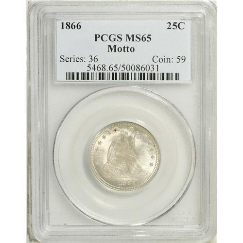 <B>1866 25C Motto MS65 PCGS.</B></I> Despite noticeable weakness of the designs at the center of the obverse and reverse, this is a stunning Gem that is among the finest known pieces of this first-year of issue type coin. The mintage of this date was just 16,800 business strikes and another 725 proofs. Although Walter Breen reported that many Mint State examples were recovered from proof sets of the year, we doubt that the quantity was all that high. This example is fully brilliant with a hint of champagne toning. The fields are reflective, with fully lustrous devices and excellent cameo contrast. Population: 2 in 65, 1 finer (10/06).<BR><I>From The Park Cities Collection.</B></I><BR><BR><b>Shipping:</b> Coin/Currency (<a target="_blank" href="http://www.heritageauctions.com/common/shipping.php">view shipping information</a>)