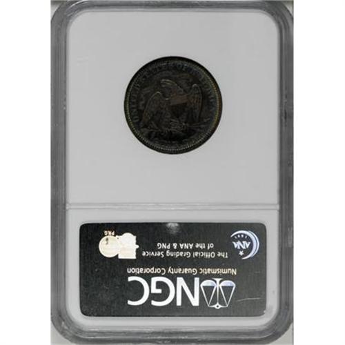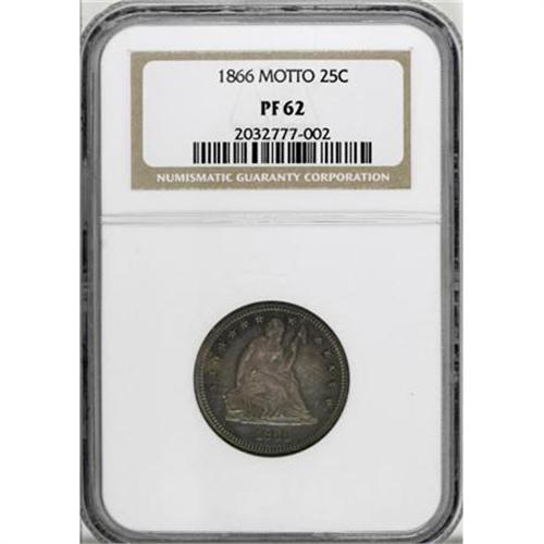 <B>1866 25C Motto PR62 NGC.</B></I> Dusky rose-colored centers deepen to cobalt-blue around the peripheries. When angled just so, the proof mirrors still flash through the deep toning.<BR><BR><B>Coin Engraver:</B> Christian Gobrecht<BR><BR><b>Shipping:</b> Coins & Currency (<a target="_blank" href="http://www.heritageauctions.com/common/shipping.php">view shipping information</a>)