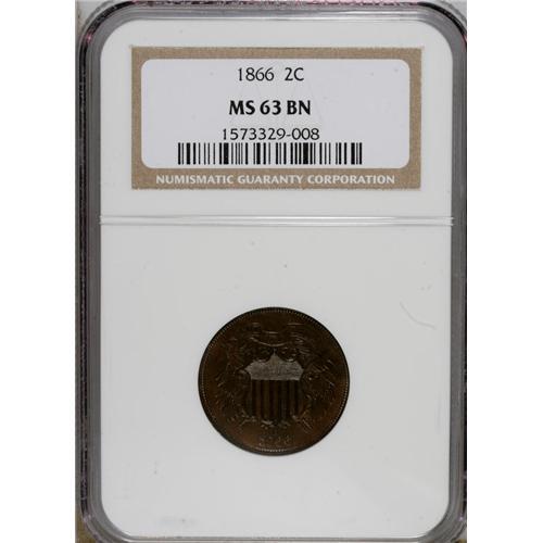 <B>1866 2C MS63 Brown NGC.</B></I> NGC Census: (31/89). PCGS Population (26/31). Mintage: 3,177,000. Numismedia Wsl. Price for NGC/PCGS coin in MS63: $125. (#3588)<BR><BR><b>Shipping:</b> Coins & Currency (<a target="_blank" href="http://www.heritageauctions.com/common/shipping.php">view shipping information</a>)