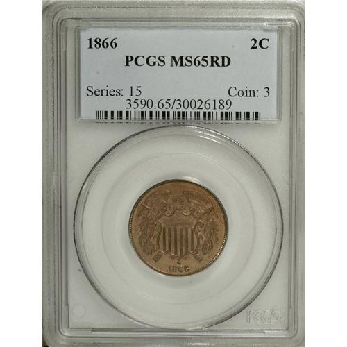 <B>1866 2C MS65 Red PCGS.</B></I> Comprehensive satin luster bedazzles this exquisitely struck and attractive representative. Clean aside from a couple of minor marks near the denomination. Population: 31 in 65 Red, 7 finer (3/07).<BR><BR><b>Shipping:</b> Coins & Currency (<a target="_blank" href="http://www.heritageauctions.com/common/shipping.php">view shipping information</a>)
