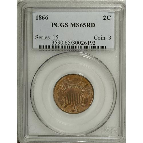 1866 2C MS65 Red PCGS. Rich peach luster bathes this s