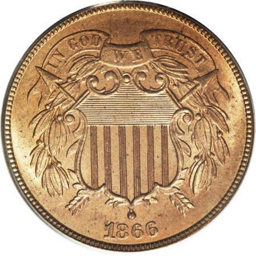 <B>1866 2C MS65 Red PCGS.</B></I> The warm copper-orange surfaces of this Gem remain vibrant and fresh. The strike is solid, and the overall preservation and eye appeal are remarkable. Though the two cent piece had an important role during the Civil War years, demand waned dramatically after the end of the conflict, and total production for 1866 fell below 3.2 million pieces. Population: 34 in 65 Red, 7 finer (12/07).<BR><BR><B>Coin Engraver:</B> James B. Longacre<BR><BR><b>Shipping:</b> Coins & Currency (<a target="_blank" href="http://www.heritageauctions.com/common/shipping.php">view shipping information</a>)