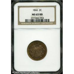 1866 2C MS65 Red and Brown NGC. Rich amber-orange <B>1866 2C MS65 Red and Brown NGC.</B></I> Rich amber-orange patina encircles both sides, leaving relatively small windows of lighter golden-tan coloration in the centers. Population: 62 in 65, 7 finer (10/04). <BR><BR><B>Important notice:</B> Heritage usually auctions material at the rate of 200-250 lots per hour. On some occasions eBay Live bid software or the Internet may not be able to keep up with the pace of the auction. We recommend placing a realistic absentee bid now as insurance to avoid disappointment. Occasionally the auctioneer may eliminate or reject an eBay Live bid, and the auctioneer may also reopen a lot after the close of the eBay live bidding (usually because we missed an audience bid), and may reject your bid even if it shows you as the winning bidder. By bidding via eBay Live, you agree that Heritage may award the lot to another bidder at its sole discretion under the circumstances described above or any other reasonable circumstances. Since eBay bids are not shown to us until we open the lot on the floor, we treat those bids just like floor bids. In most cases the floor responds before the eBay bid is presented to us, due to Internet lag time, so for consistency we have made it a policy that floor bids are always considered first over tie eBay live bids. Also please note that all Heritage lots purchased through eBay Live carry a 20% Buyer's Premium. Please make sure you read the Terms and Conditions before you bid. This lot is being auctioned in conjunction with a live floor auction by Heritage Galleries & Auctioneers. All final auction and invoice information will be supplied by Heritage Galleries & Auctioneers, and all other information should be considered preliminary. Lot:5468