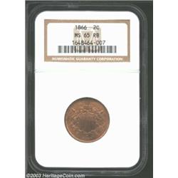 1866 2C MS65 Red and Brown NGC. This lot offers a mostly lustrous, pinkish-orange example whose surf