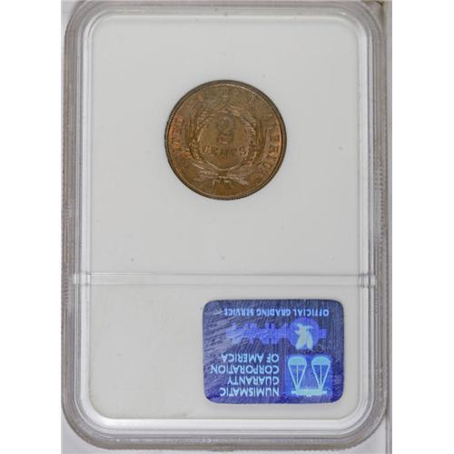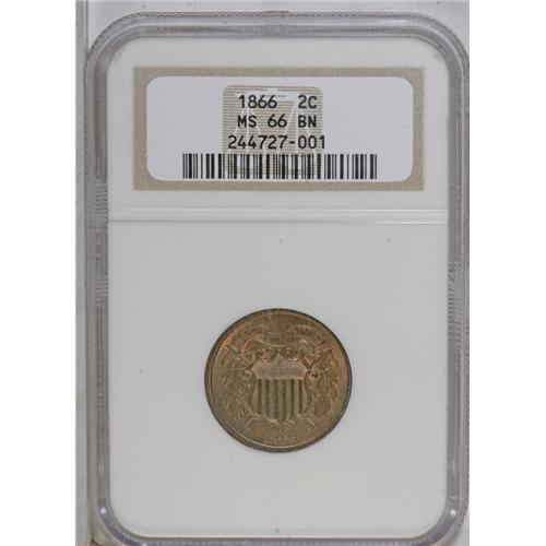 <B>1866 2C MS66 Brown NGC.</B></I> Solidly struck with violet-tinged medium brown surfaces that have intermittent areas of faded copper-orange. A minor spot appears to the left of the third vertical stripe in the shield. Census: 5 in 66 Brown, 0 finer (8/06).<BR><I>From The Jones Beach Collection.</B></I><BR><BR><b>Shipping:</b> Coin/Currency (<a target="_blank" href="http://www.heritageauctions.com/common/shipping.php">view shipping information</a>)