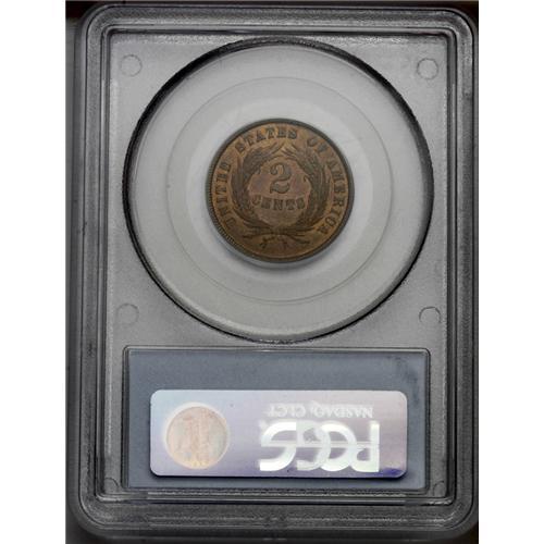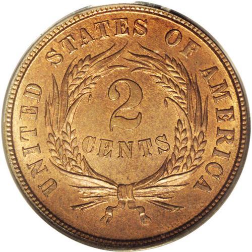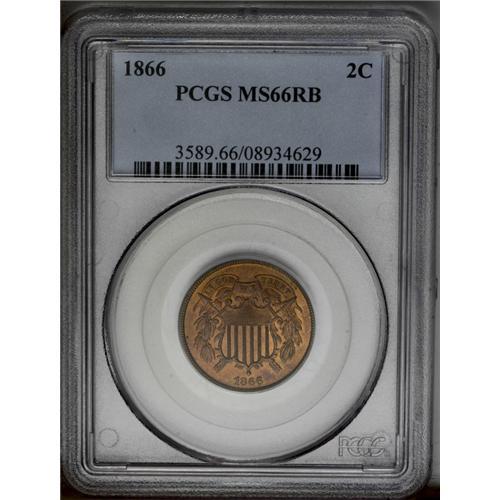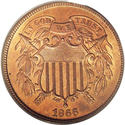 <B>1866<2C> MS66 Red and Brown PCGS.</B></I> This lustrous and boldly impressed Premium Gem is predominantly apricot-gold, although wisps of lilac patina are just sufficient to deny a full Red designation. Only a solitary carbon fleck is detected, and it is confined to the obverse border at 9 o'clock.