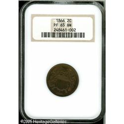 <B>1866 2C PR65 Brown NGC.</B></I> The deep purple-rose and red-gold coloration, that adorns both sides of this typically sharply struck Gem proof, belies the Brown color designation from NGC, although the piece is admittedly neither Red, nor Red and Brown. It is, however, a lovely, nearly pristine, attractively toned specimen. Lot:5635