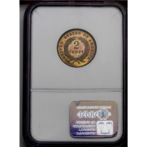 <B>1866<2C> PR66 Red and Brown NGC.</B></I> A gorgeous Premium Gem proof two cent piece. Beautiful lime-golden and crimson-red patina blanket each side of this mostly red, highly mirrored specimen. An exceptionally attractive coin, and one of only 13 graded PR66 Red and Brown by NGC, with none finer at either service (7/06).