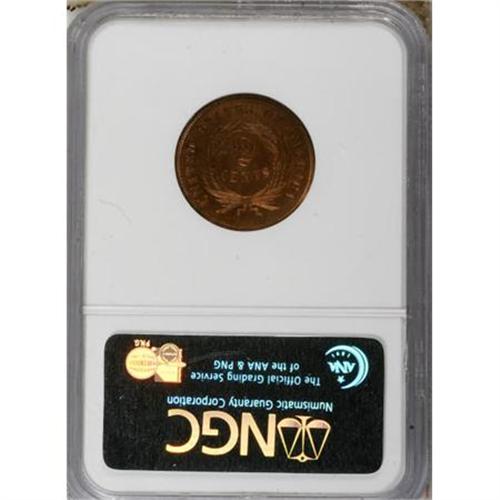 <B>1866 2C PR64 Red and Brown NGC.</B></I> NGC Census: (23/51). PCGS Population (46/59). Mintage: 725. Numismedia Wsl. Price for NGC/PCGS coin in PR64: $575. (#3631)<BR><BR><B>Coin Engraver:</B> James B. Longacre<BR><BR><b>Shipping:</b> Coins & Currency (<a target="_blank" href="http://www.heritageauctions.com/common/shipping.php">view shipping information</a>)