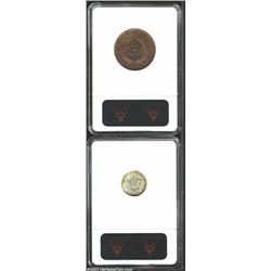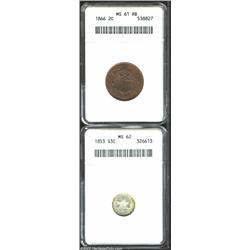 1866 2C Two Cent Piece MS61 Red and Brown ANACS, a little subdued, yet possessed of generally smooth surfaces with orange-red, lilac, and medium brown colors all in evidence; and an 1853 Three Cent Silver MS62 ANACS, sharply struck for the type, both sides are free of singularly mentionable abrasions with some dappled orange-tan rim accents.From the Ohio Collection. 2 coins Important notice: We expect to be auctioning lots at the rate of 200-250 per hour. Sometimes eBay Premier live bid software cannot keep up with that pace, so we strongly recommend that you place a realistic proxy bid now as insurance to avoid disappointment. Also please note that all Heritage/CAA lots purchased through eBay Premier carry a 20% Buyer's Premium. Please make sure you read the Terms and Conditions.