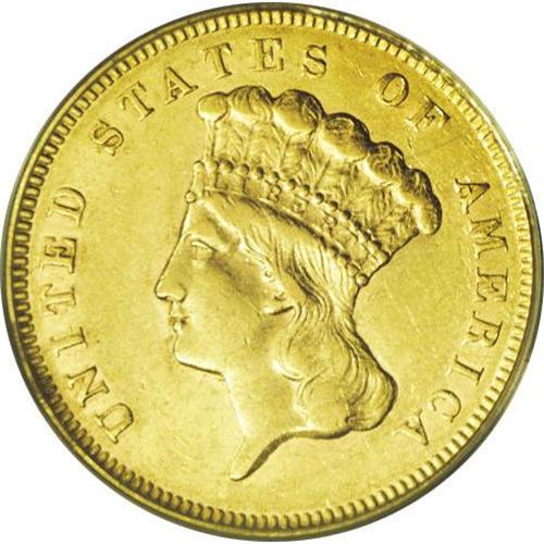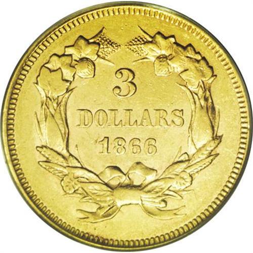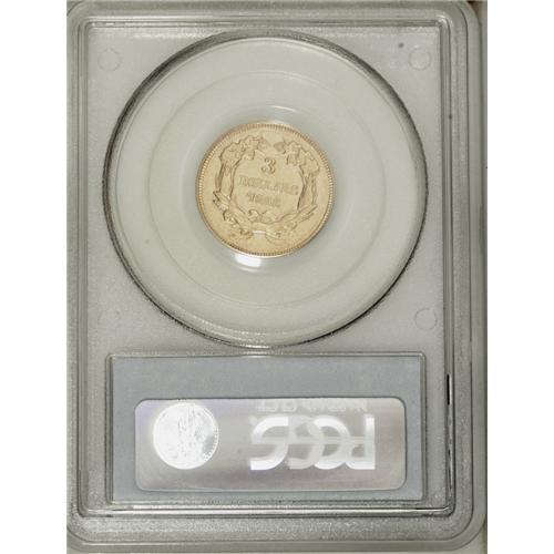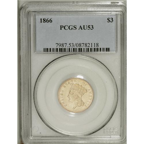 <B>1866<$3> AU53 PCGS.</B></I> One of the more commonly available threes from the 1860s, and a difficult issue to locate any finer than XF. Bright yellow-gold surfaces still exhibit traces of luster in some of the protected areas. Nice detail is evident on most of the design elements, and just a few minor contact marks occur over each side.