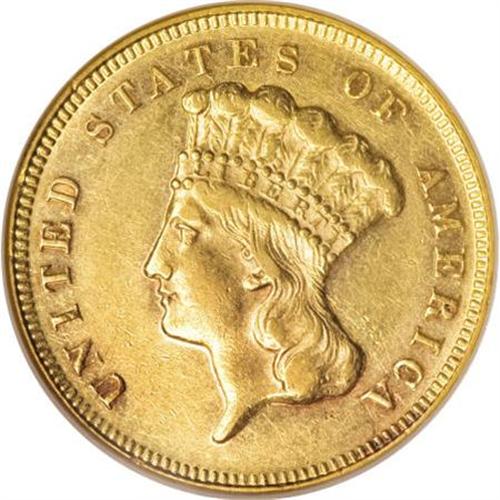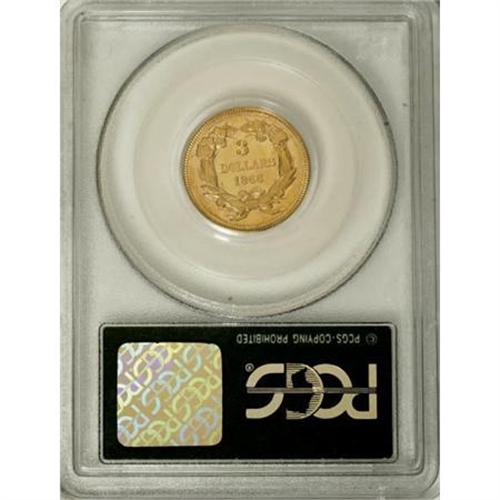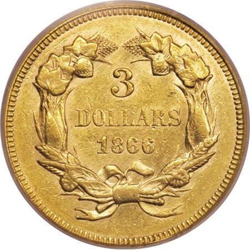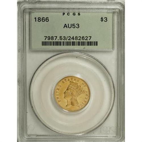 <B>1866 $3 AU53 PCGS.</B></I> The highpoints have a hint of wear, but luster dominates the legends, wreath, and crown. Thorough inspection locates no remotely mentionable marks. A mere 4,000 business strikes were coined, and it is likely that less than 10% of the mintage has survived. Housed in a green label holder.<BR><BR><b>Shipping:</b> Coins & Currency (<a target="_blank" href="http://www.heritageauctions.com/common/shipping.php">view shipping information</a>)