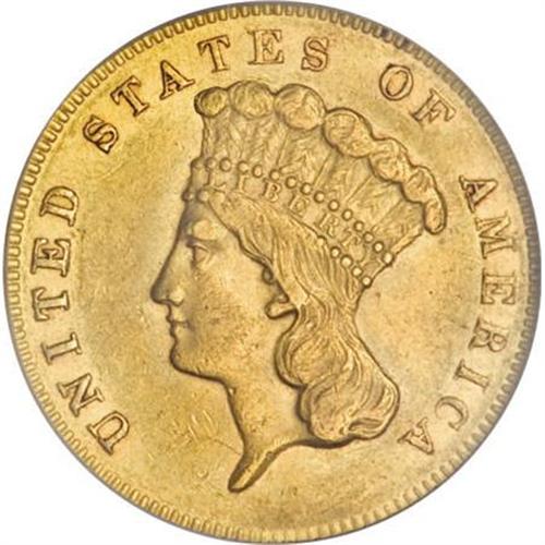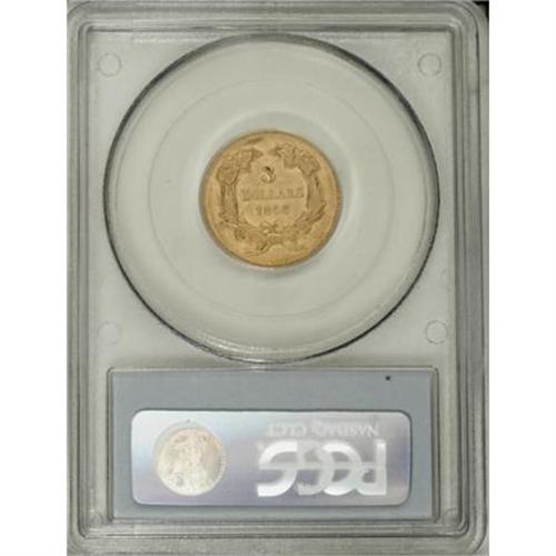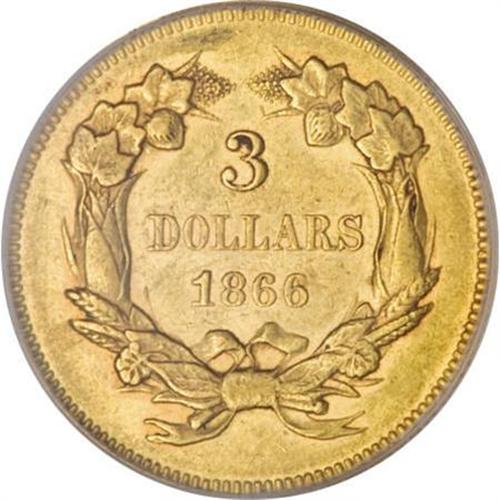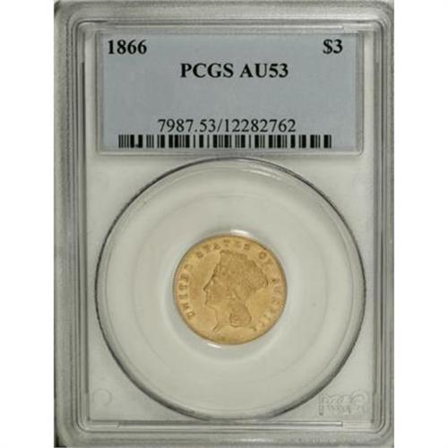 <B>1866 $3 AU53 PCGS.</B></I> Three dollar gold mintages increased somewhat after the Civil War to levels that were not quite so minimalist, while still scarce. This piece shows pretty orange-gold surfaces characterized by a short stay in circulation, but the only singular mark is a small scrape near the 1 in the date.<BR><BR><B>Coin Engraver:</B> James B. Longacre<BR><BR><b>Shipping:</b> Coins & Currency (<a target="_blank" href="http://www.heritageauctions.com/common/shipping.php">view shipping information</a>)
