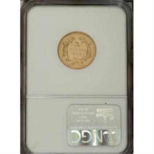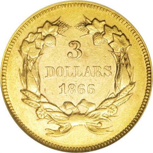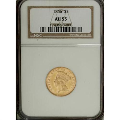 <B>1866 $3 AU55 NGC.</B></I> The 1866 three dollar gold coins are rarities in all levels. David Bowers (2005) writes that only 200 or so are believed to exist, of which maybe 24 to 40 are in Mint State. This Choice AU example is well detailed, and possesses brass-gold surfaces with traces of luster in the recesses. Both sides reveal a scattering of light marks, the most notable on the cheek.<BR><BR><B>Coin Engraver:</B> James B. Longacre<BR><BR><b>Shipping:</b> Coins & Currency (<a target="_blank" href="http://www.heritageauctions.com/common/shipping.php">view shipping information</a>)