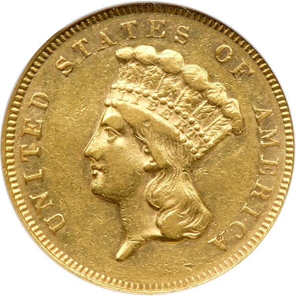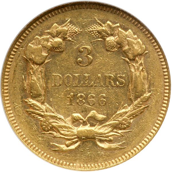 1866 $3 Gold. NGC graded AU-53. Only 4,030 minted of this important low-mintage issue struck in the troubled 1860s. Gold coin production was erratic in Philadelphia in the years from 1861 to 1878 due to dislocations in the gold market because of the fiat money greenbacks. Pop 13; 121 finer (PCGS # 7987) .