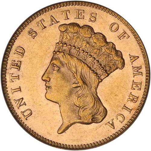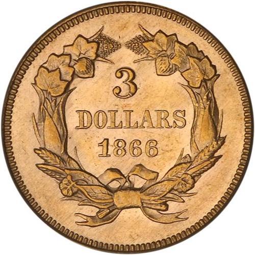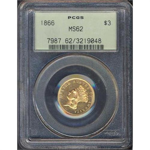 <b>1866 $3 Gold. PCGS graded MS62.</b> The 1866 $3 gold coin, of which just 4,000 circulation strikes were made, is a good coin to consider for a gold type set. It has more charm and is much scarcer than the 1854, 1874, and 1878 common dates, yet doesn't require a much larger outlay in this quality. Yet as few as 180-200 worn pieces exist, to which can be added nor more than 25 to 40 in Mint State. Among the Mint State coins this is one of the sharpest in its grade, and should be classified "prooflike" due to the nicely reflective fields offsetting the frosted devices <b>(PCGS # 7987)</b> <i>