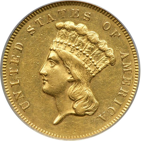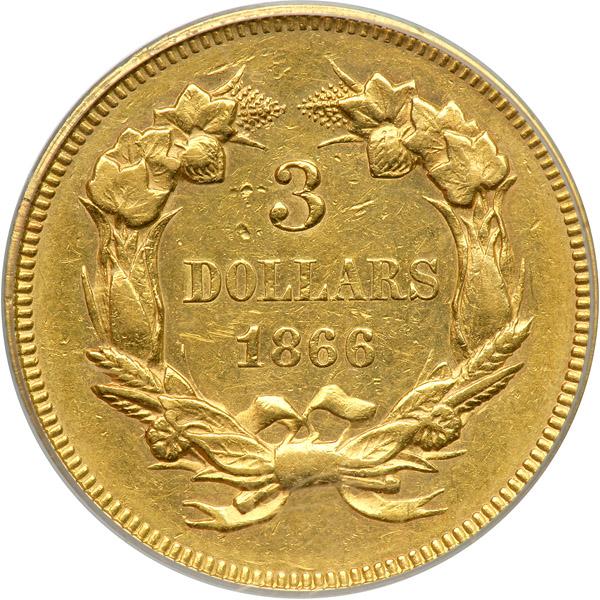1866. PCGS graded AU-50. Even light gold toning. Only 4000 struck. Pop 19 (PCGS # 7987) .