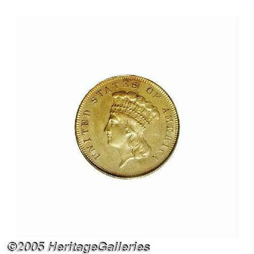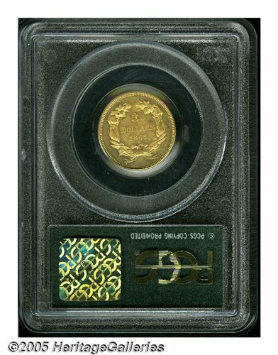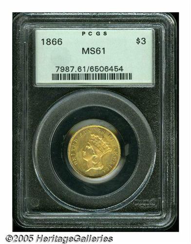<B>1866<$3> MS61 PCGS.</B></I> An earlier issue in this curious series, the 1866 was produced to the extent of only 4,000 business strikes. Mint State examples are considerably rarer than those of the 1856 and 1878 issues. This semi-prooflike example reveals flashy fields at select angles. The overall appearance is one of deep, rich, orange-gold color, but there are some crimson tinted accents over the highest points of the design. A strong candidate for inclusion in an advanced type set.<BR><I>From The Stig Ericsson Collection.</B></I>