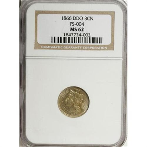 <B>1866 3CN Double Die Obverse MS62 NGC.</B></I> FS-004. NGC Census: (60/356). PCGS Population (67/398). Mintage: 4,801,000. Numismedia Wsl. Price for NGC/PCGS coin in MS62: $108. (#3732)<BR><BR><B>Coin Engraver:</B> James B. Longacre<BR><BR><b>Shipping:</b> Coins & Currency (<a target="_blank" href="http://www.heritageauctions.com/common/shipping.php">view shipping information</a>)