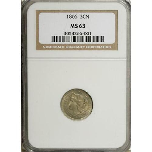 <B>1866 3CN MS63 NGC.</B></I> NGC Census: (102/262). PCGS Population (163/247). Mintage: 4,801,000. Numismedia Wsl. Price for NGC/PCGS coin in MS63: $130. (#3732)<BR><BR><B>Coin Engraver:</B> James B. Longacre<BR><BR><b>Shipping:</b> Coins & Currency (<a target="_blank" href="http://www.heritageauctions.com/common/shipping.php">view shipping information</a>)