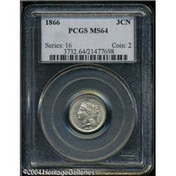 1866 3CN MS64 PCGS. Nickel-gray lustrous surfaces <B>1866 3CN MS64 PCGS.</B></I> Nickel-gray lustrous surfaces are heavily clashmarked on both sides. Well struck, with no mentionable abrasions. <BR><BR><B>Important notice:</B> Heritage usually auctions material at the rate of 200-250 lots per hour. On some occasions eBay Live bid software or the Internet may not be able to keep up with the pace of the auction. We recommend placing a realistic absentee bid now as insurance to avoid disappointment. Occasionally the auctioneer may eliminate or reject an eBay Live bid, and the auctioneer may also reopen a lot after the close of the eBay live bidding (usually because we missed an audience bid), and may reject your bid even if it shows you as the winning bidder. By bidding via eBay Live, you agree that Heritage may award the lot to another bidder at its sole discretion under the circumstances described above or any other reasonable circumstances. Since eBay bids are not shown to us until we open the lot on the floor, we treat those bids just like floor bids. In most cases the floor responds before the eBay bid is presented to us, due to Internet lag time, so for consistency we have made it a policy that floor bids are always considered first over tie eBay live bids. Also please note that all Heritage lots purchased through eBay Live carry a 20% Buyer's Premium. Please make sure you read the Terms and Conditions before you bid. This lot is being auctioned in conjunction with a live floor auction by Heritage Galleries & Auctioneers. All final auction and invoice information will be supplied by Heritage Galleries & Auctioneers, and all other information should be considered preliminary. Lot:5488