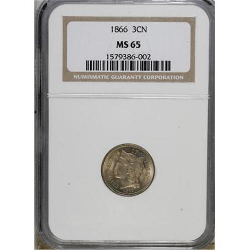 <B>1866 3CN MS65 NGC.</B></I> NGC Census: (61/16). PCGS Population (59/18). Mintage: 4,801,000. Numismedia Wsl. Price for NGC/PCGS coin in MS65: $575. (#3732)<BR><BR><B>Coin Engraver:</B> James B. Longacre<BR><BR><b>Shipping:</b> Coins & Currency (<a target="_blank" href="http://www.heritageauctions.com/common/shipping.php">view shipping information</a>)