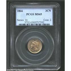 1866 3CN MS65 PCGS. The attractive golden-brown patina is evenly distributed across each side. A lus