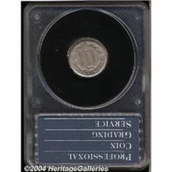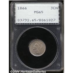 <B>1866<3CN> MS65 PCGS.</B></I> A pleasing, light to medium silver-gray patina graces both sides of this attractive Three Cent Copper-Nickel piece. The strike is above average for the issue, with relatively strong detail showing throughout, and the surfaces appear to be well preserved, with no serious abrasions or spotting evident. Housed in a first generation PCGS holder. Population: 45 in 65, 5 finer (3/04). <BR><BR><B>Important notice:</B> Heritage usually auctions material at the rate of 200-250 lots per hour. On some occasions eBay Live bid software or the Internet may not be able to keep up with the pace of the auction. We recommend placing a realistic absentee bid now as insurance to avoid disappointment. Occasionally the auctioneer may eliminate or reject an eBay Live bid, and the auctioneer may also reopen a lot after the close of the eBay live bidding (usually because we missed an audience bid), and may reject your bid even if it shows you as the winning bidder. By bidding via eBay Live, you agree that Heritage may award the lot to another bidder at its sole discretion under the circumstances described above or any other reasonable circumstances. Since eBay bids are not shown to us until we open the lot on the floor, we treat those bids just like floor bids. In most cases the floor responds before the eBay bid is presented to us, due to Internet lag time, so for consistency we have made it a policy that floor bids are always considered first over tie eBay live bids. Also please note that all Heritage lots purchased through eBay Live carry a 20% Buyer's Premium. Please make sure you read the Terms and Conditions before you bid.