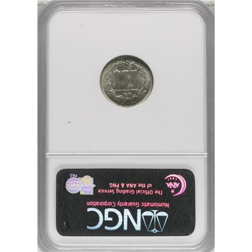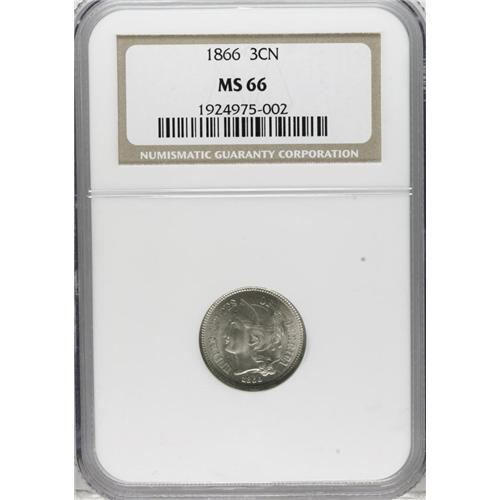 <B>1866 3CN MS66 NGC.</B></I> Heavy die clash marks are observed on both sides of this lustrous, untoned Premium Gem. A wavy texture to some of the fields is evidence of minor die wear. Well preserved and free of distractions. Census: 9 in 66, 4 finer (4/07).<BR><BR><b>Shipping:</b> Coins & Currency (<a target="_blank" href="http://www.heritageauctions.com/common/shipping.php">view shipping information</a>)