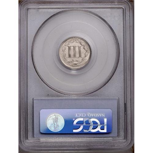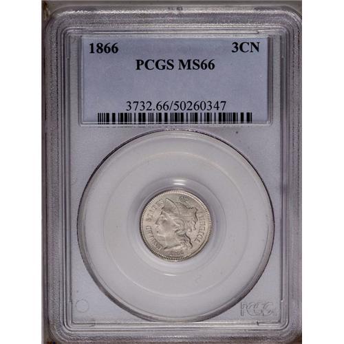 <B>1866<3CN> MS66 PCGS.</B></I> This lustrous and gorgeously unblemished Premium Gem is delicately toned in dove-gray and chestnut tints. Crisply struck for the business strike type. Prominently clashed on each side. Population: 11 in 66, 2 finer (4/06).