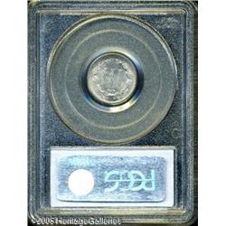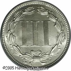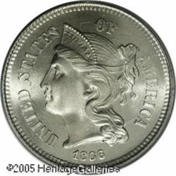 <B>1866 3CN MS67 PCGS.</B></I> Bright, lustrous surfaces that show a light amount of subtle steel-silver toning. Noticeably die clashed on each side as is often seen, numerous die striations are also present on the reverse. Population: 2 in 67, 0 finer (1/05). Lot:5694