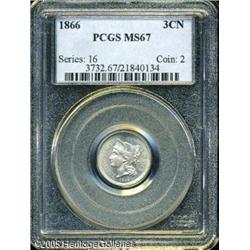 1866 3CN MS67 PCGS. Bright, lustrous surfaces that