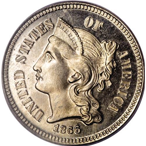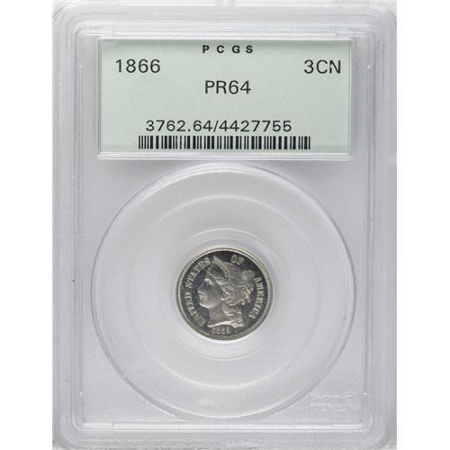 <B>1866 3CN Three Cent Nickel PR64 PCGS.</B></I> Well struck and lightly toned with mild cameo contrast. Within the three cent nickel series, the early dates are scarce in proof while Mint State pieces are common, unlike the final dates of the type, which are common in proof and scarce in Mint State. Housed in a green label holder.<BR><BR><b>Shipping:</b> Coin/Currency (<a target="_blank" href="http://www.heritageauctions.com/common/shipping.php">view shipping information</a>) <BR><BR><B>Importan